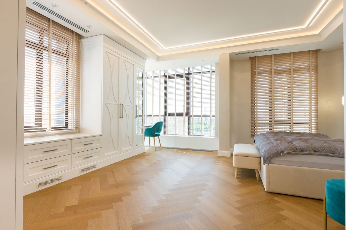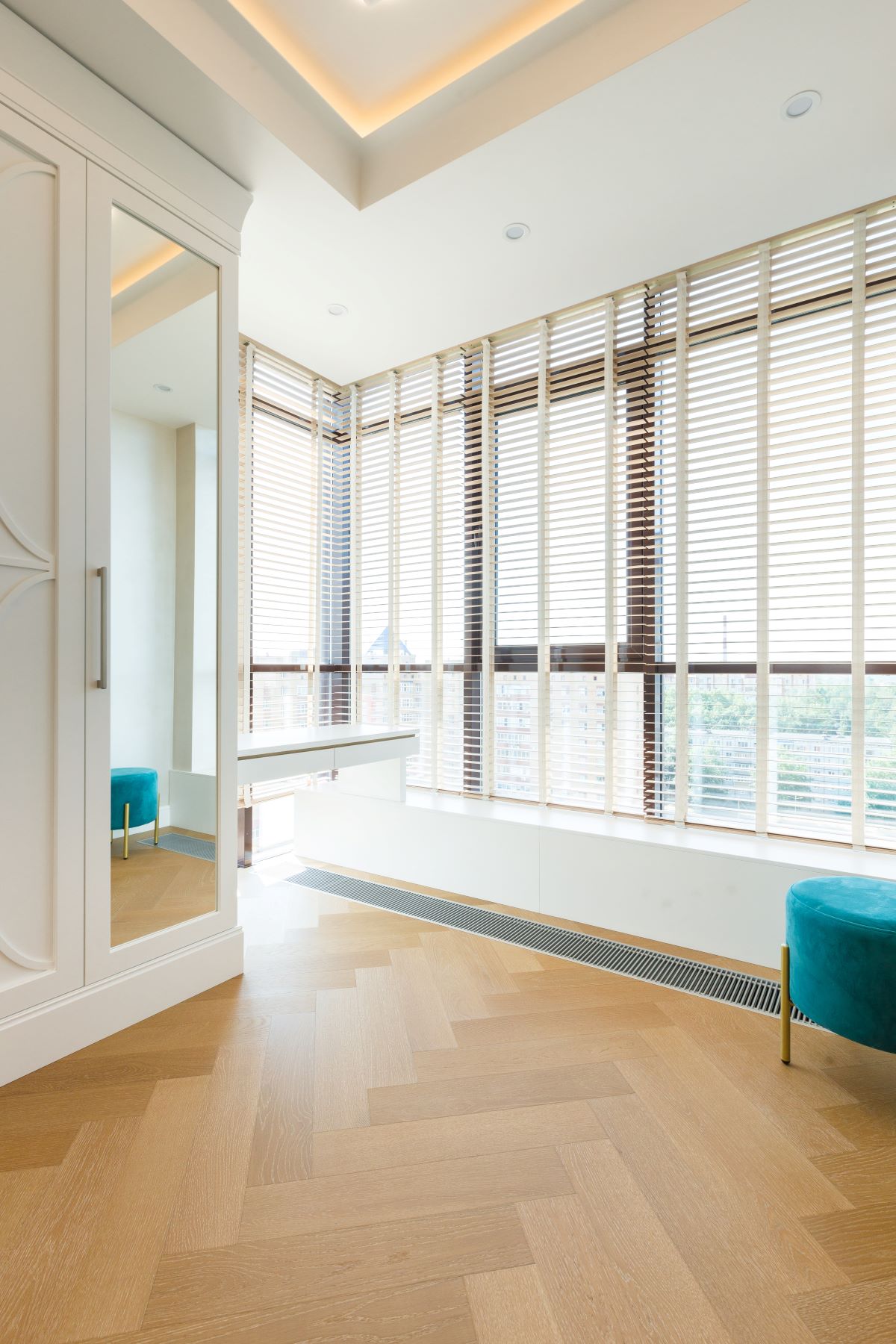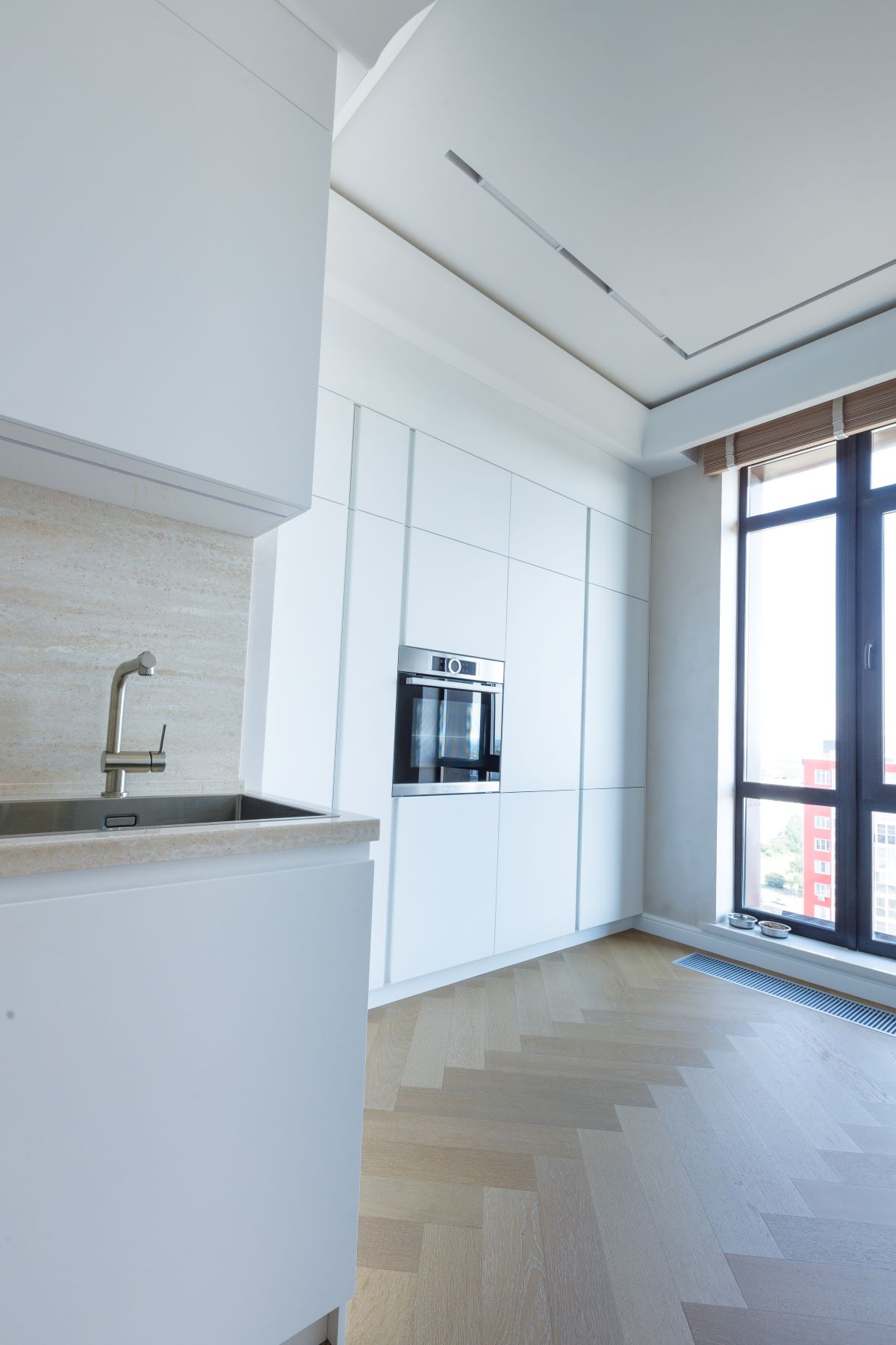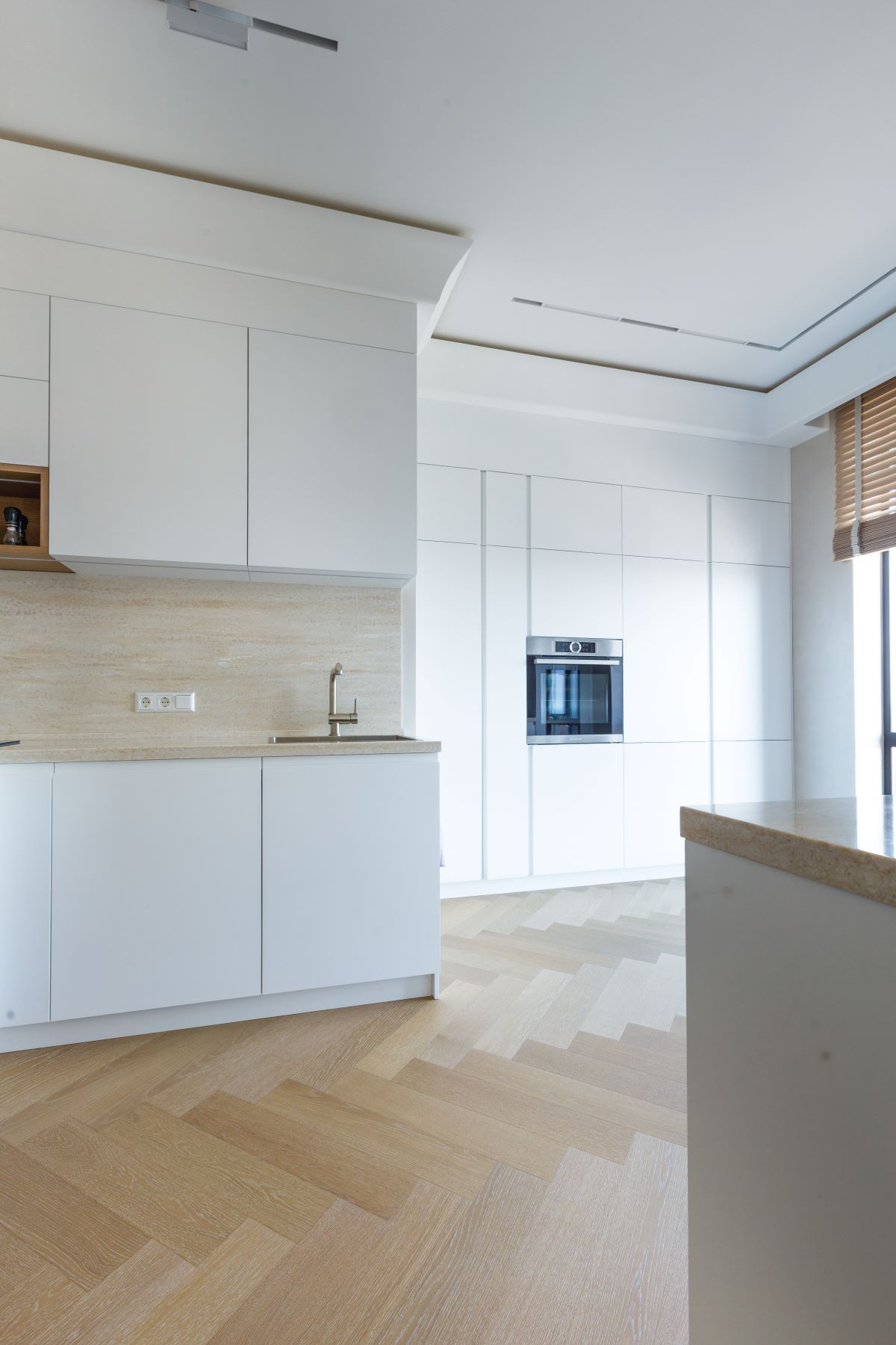 Чистота белого и геометрия линий смягчаются деревом и мягким матовым текстилем.