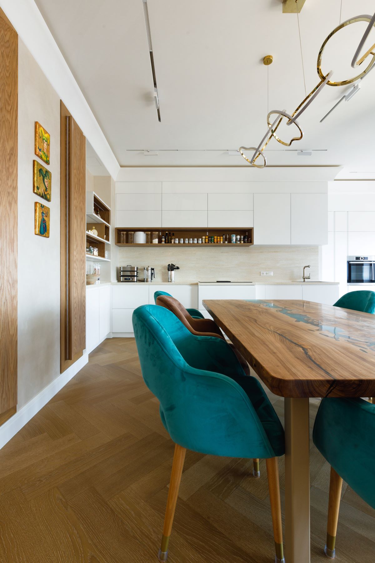 Гармоничный интерьер, наполненный прямыми линиями и световыми акцентами, украшает мебель насыщенного бирюзового цвета.